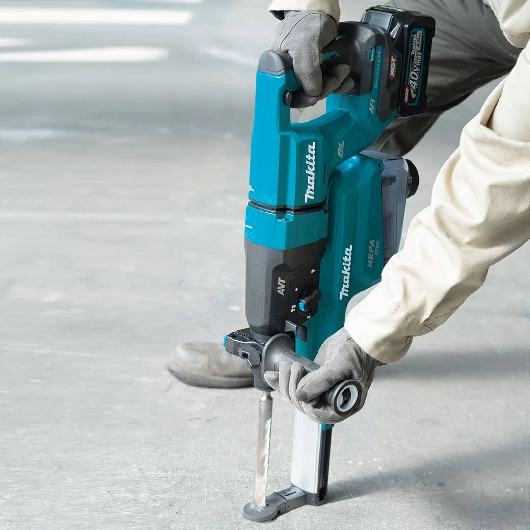 The 40V max XGT® Brushless 1-1/8″ AVT® Rotary Hammer with Dust Extractor Kit (GRH07M1W) is a cordless concrete solution engineered for heavy-load applications. It delivers the power, speed, and run-time for corded demands, and features a convenient D-handle design that is ideal for overhead, downward or hard-to-reach horizontal drilling/chipping applications.